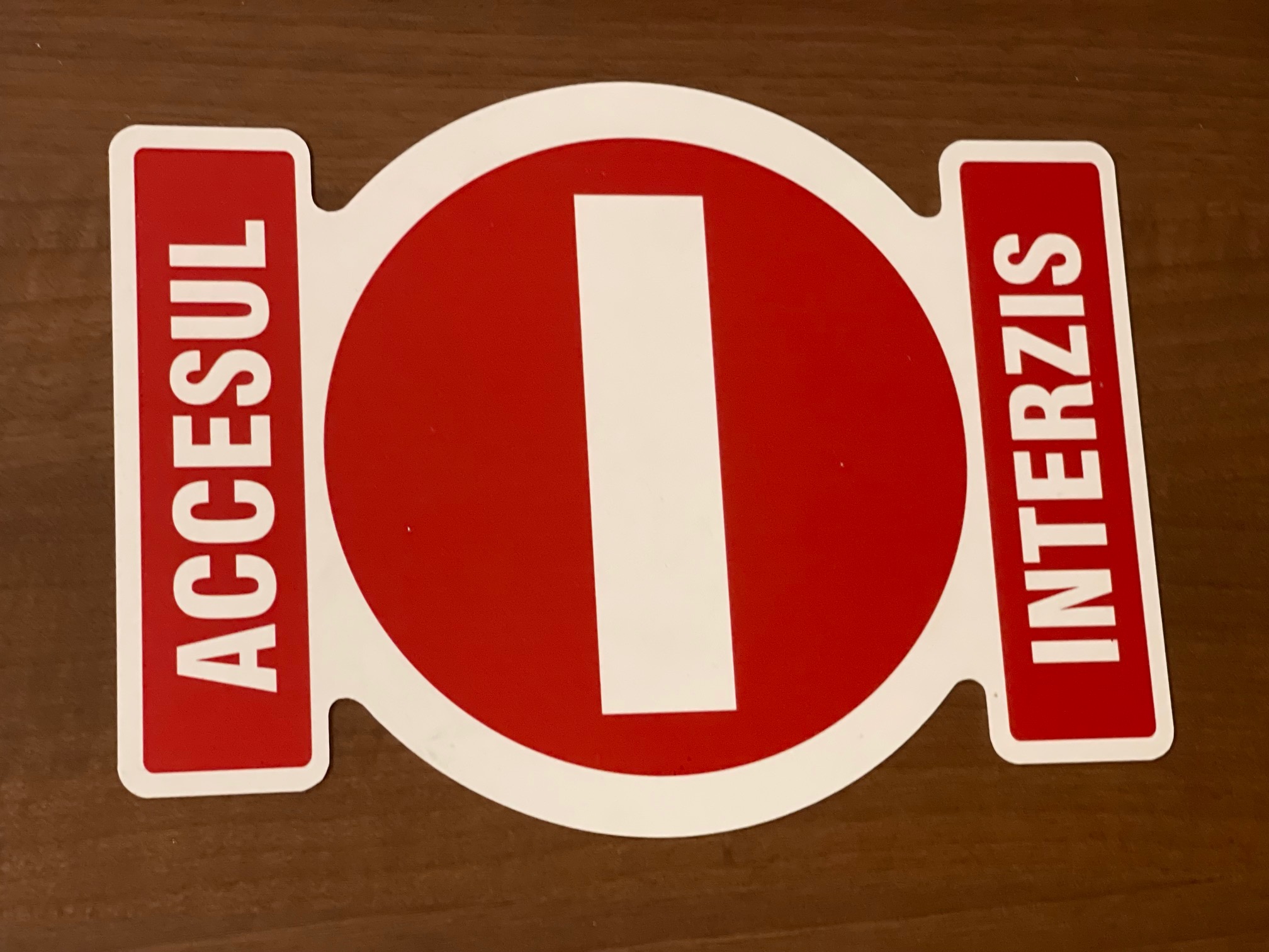 Caracteristici: : formă rotunda, pictogramă neagra pe fond alb , margine și bandă diagonală roșii, partea roșie acoperă cel putin 35% din suprafată.