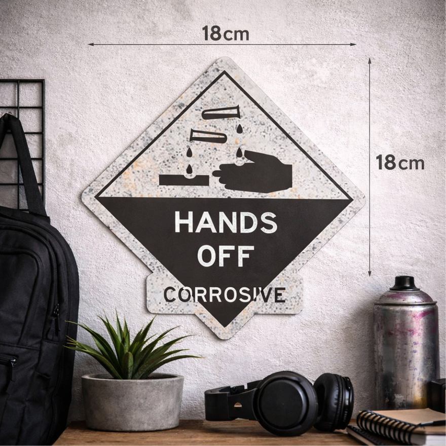 Stickerul „Hands Off – Corrosive” este un sticker de dimensiune medie, cu mesaj ironic si sugestiv, creat pentru a transmite clar ideea de „nu atinge”, intr-o forma vizuala cu atitudine.