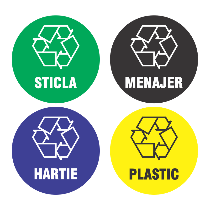 Set 4 stickere pentru colectare selectiva deseuri, realizate prin print UV-LED pe folie PVC autoadeziva de calitate, cu rezistenta ridicata si culori intense. Fiecare sticker are diametrul de 10 cm si este conceput pentru identificarea rapida si clara a recipientelor destinate reciclarii.