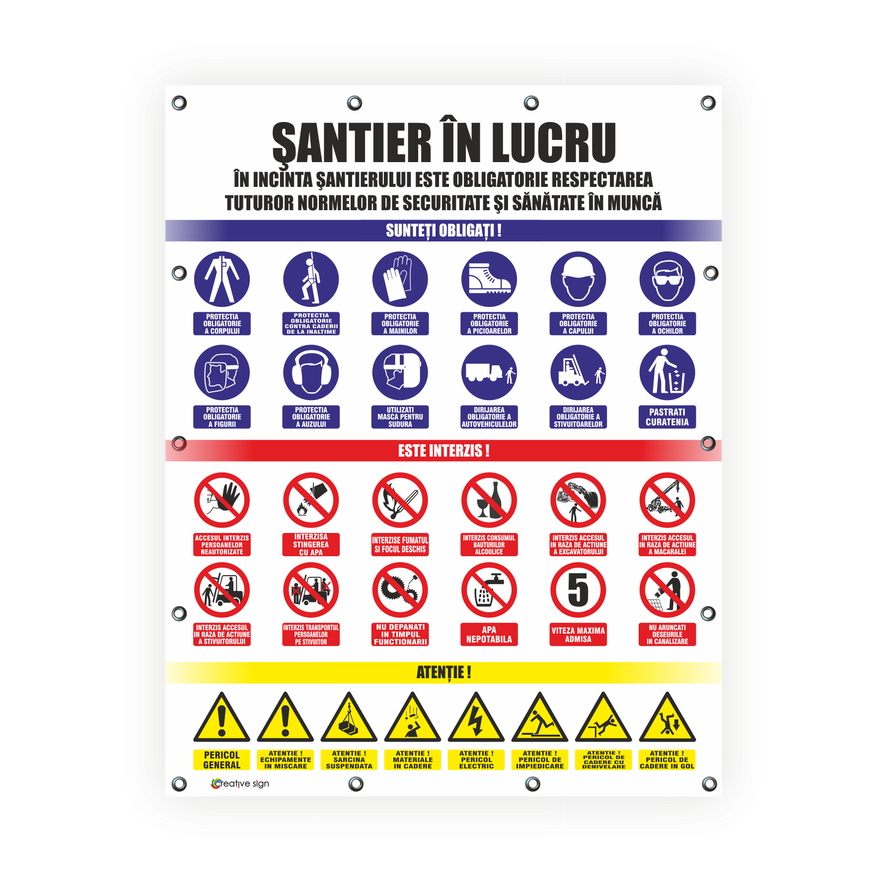 Instalare: bannerul trebuie instalat la o înalțime corespunzatoare, orientat în funcție de unghiul de vedere, ținându-se seama de eventualele obstacole, fie la intrarea intr-o zonă in cazul unui risc general, fie în imediata apropiere a unui risc determinat sau a obiectului ce trebuie semnalat și într-un loc bine iluminat, ușor accesibil si vizibil. In cazul in care condițțiile de iluminare naturala sunt precare, trebuie utilizate culori fosforescente, materiale reflectorizante sau iluminare artificială, fară a aduce atingere prevederilor legislatiei nationale care transpun Directiva 89/654/CEE.