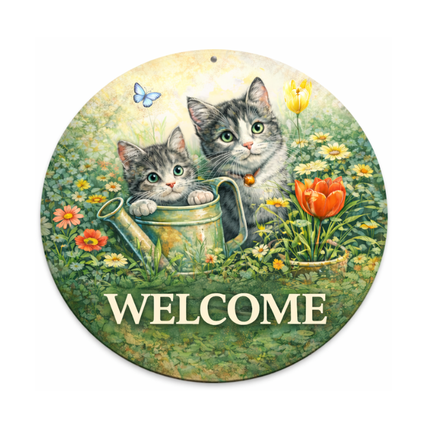 Adauga un strop de farmec si prospetime spatiului tau cu placuta decorativa „Welcome”, ilustrata cu doua pisici jucause intr-o gradina plina de flori. Un design cald si prietenos care transmite bucurie si energie pozitiva inca de la intrare.