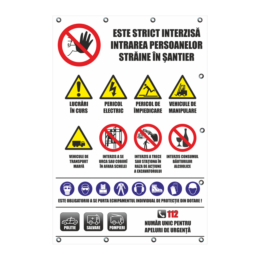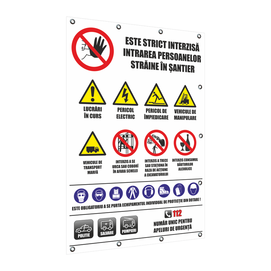 Instalare: bannerul trebuie instalat la o înalțime corespunzatoare, orientat în funcție de unghiul de vedere, ținându-se seama de eventualele obstacole, fie la intrarea intr-o zonă in cazul unui risc general, fie în imediata apropiere a unui risc determinat sau a obiectului ce trebuie semnalat și într-un loc bine iluminat, ușor accesibil si vizibil. In cazul in care condițțiile de iluminare naturala sunt precare, trebuie utilizate culori fosforescente, materiale reflectorizante sau iluminare artificială, fară a aduce atingere prevederilor legislatiei nationale care transpun Directiva 89/654/CEE.