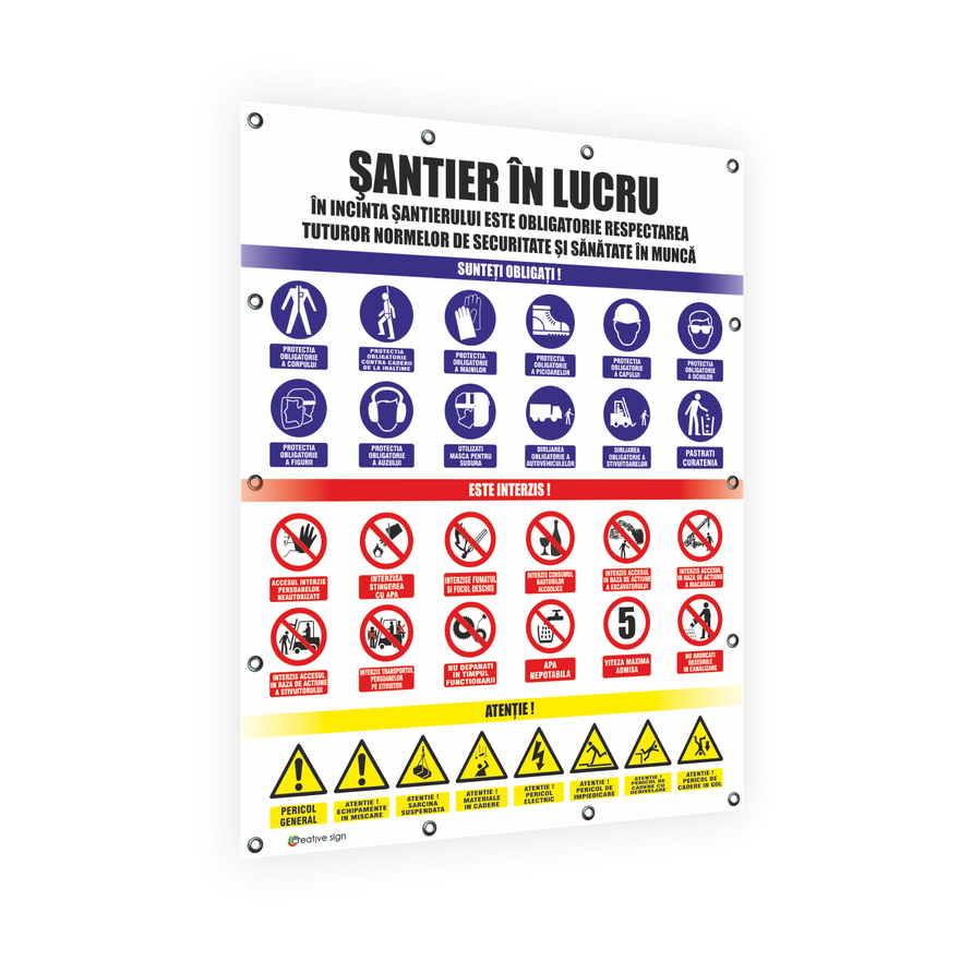 Instalare: bannerul trebuie instalat la o înalțime corespunzatoare, orientat în funcție de unghiul de vedere, ținându-se seama de eventualele obstacole, fie la intrarea intr-o zonă in cazul unui risc general, fie în imediata apropiere a unui risc determinat sau a obiectului ce trebuie semnalat și într-un loc bine iluminat, ușor accesibil si vizibil. In cazul in care condițțiile de iluminare naturala sunt precare, trebuie utilizate culori fosforescente, materiale reflectorizante sau iluminare artificială, fară a aduce atingere prevederilor legislatiei nationale care transpun Directiva 89/654/CEE.