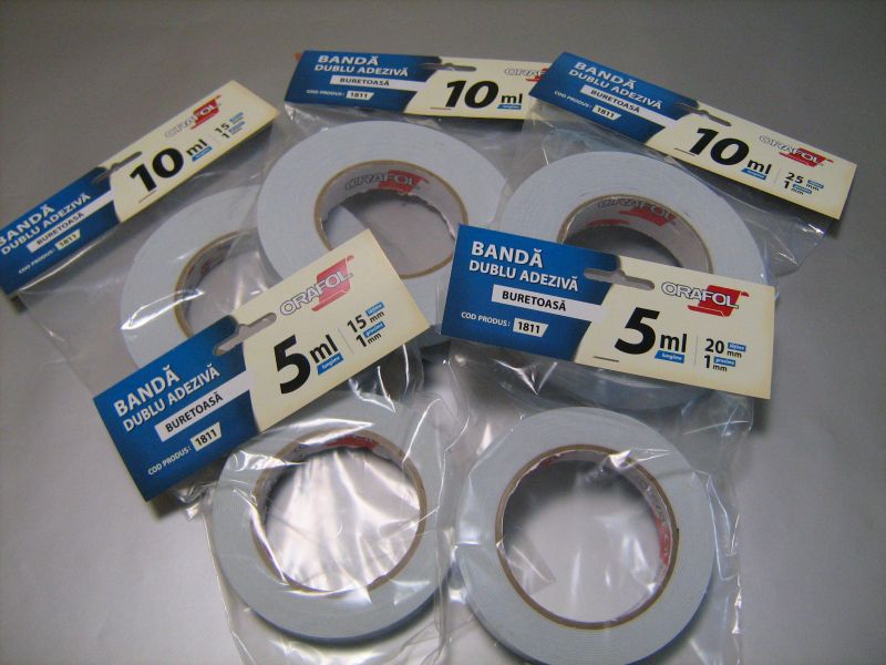 Caracteristici și avantaje: bandă dublu adezivă pe suport de burete alb (polietilena cu densitatea de 67kg/m³), cu grosimea de 1140 microni. Suportul este din hârtie albastră, siliconată pe ambele fețe.