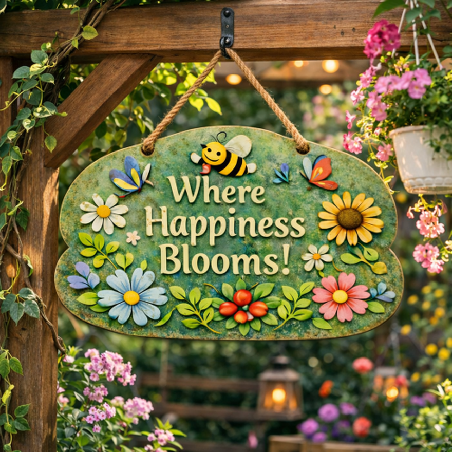Semn decorativ gradina „Where happiness blooms”, PVC 5 mm, print UV, rezistent la intemperii