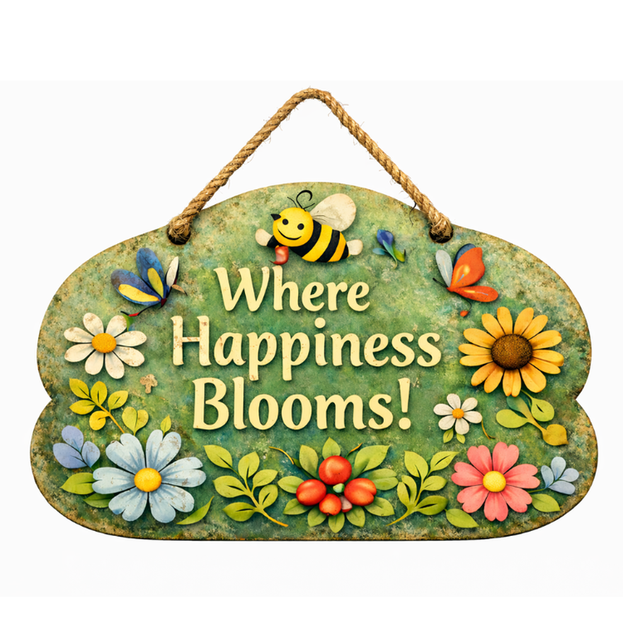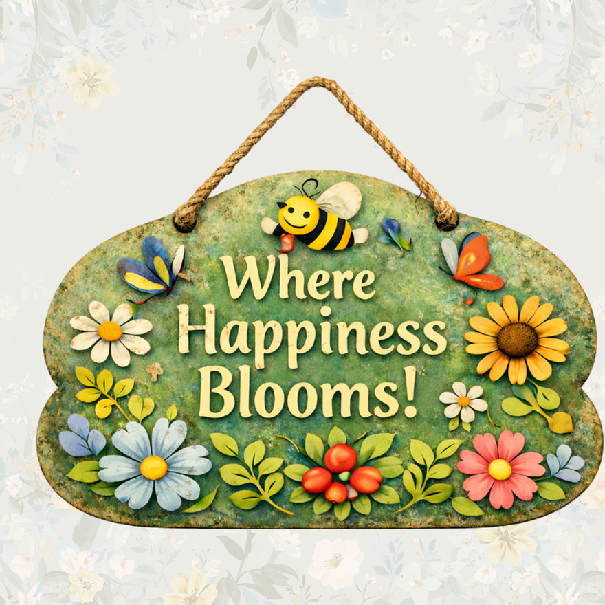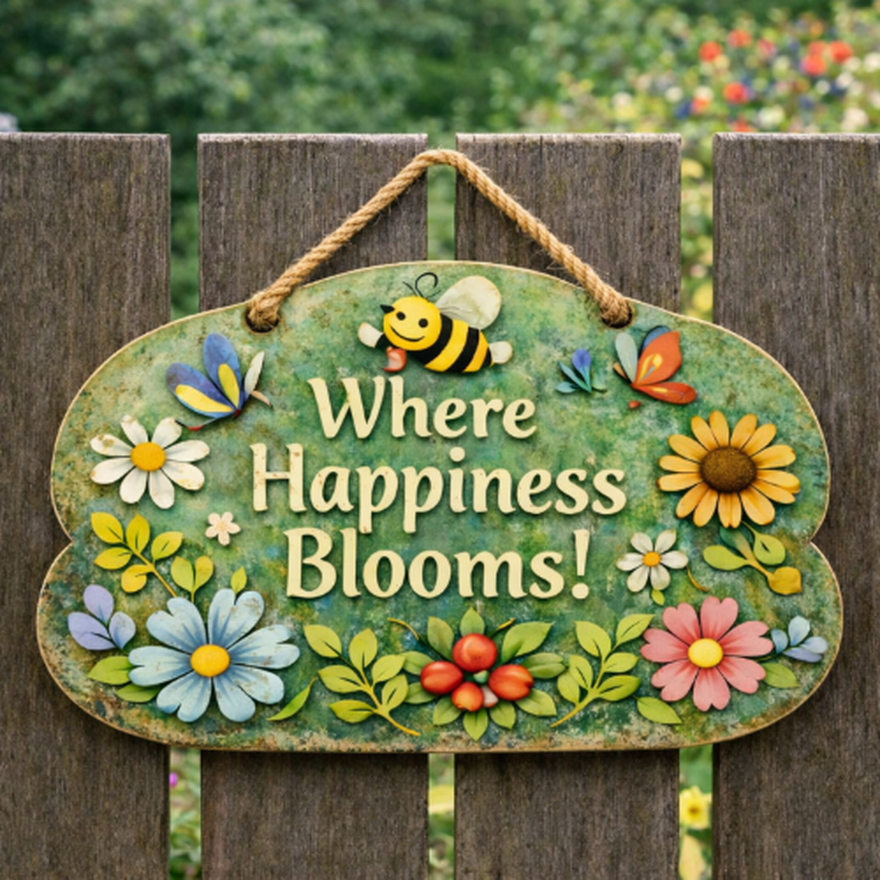 Adauga un accent cald si primitor gradinii tale cu acest semn decorativ „Where happiness blooms”. Designul cu pasari si flori creeaza o atmosfera naturala si relaxanta, perfecta pentru gradina, terasa sau intrarea in curte.