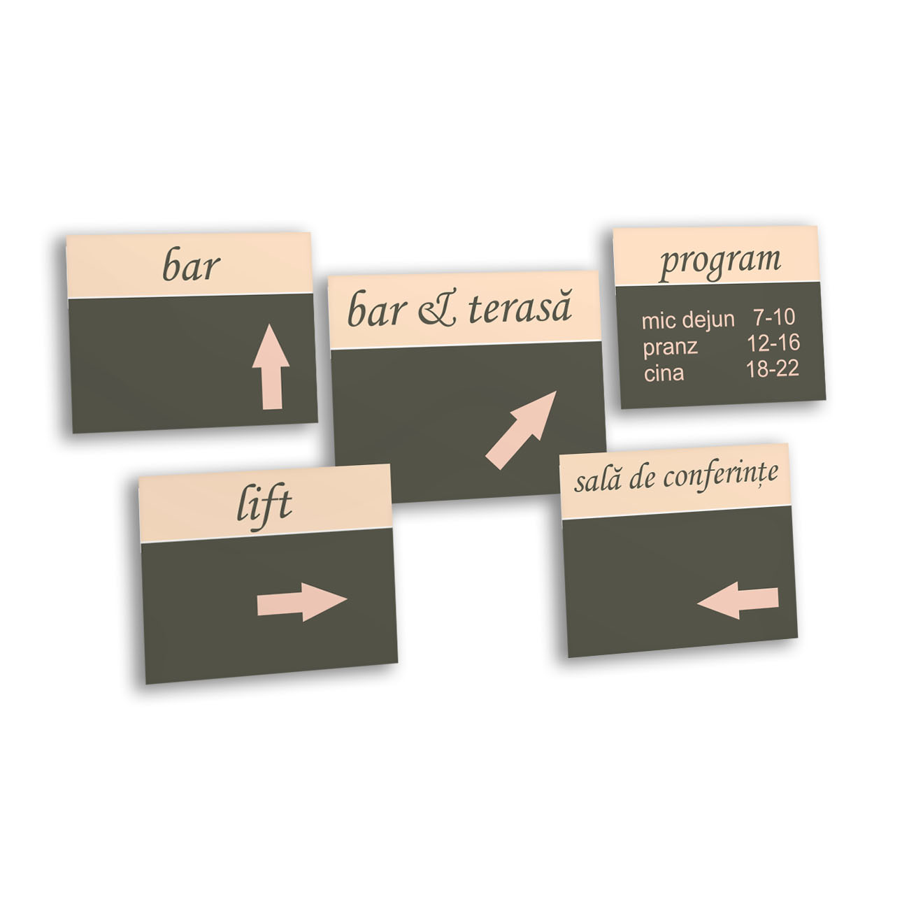 Culoare și design: la solicirea dvs indicatoarele pot fi personalizate cu sigla hotelului, pot fi adaptate ca dimensiune si combinatie de culori.