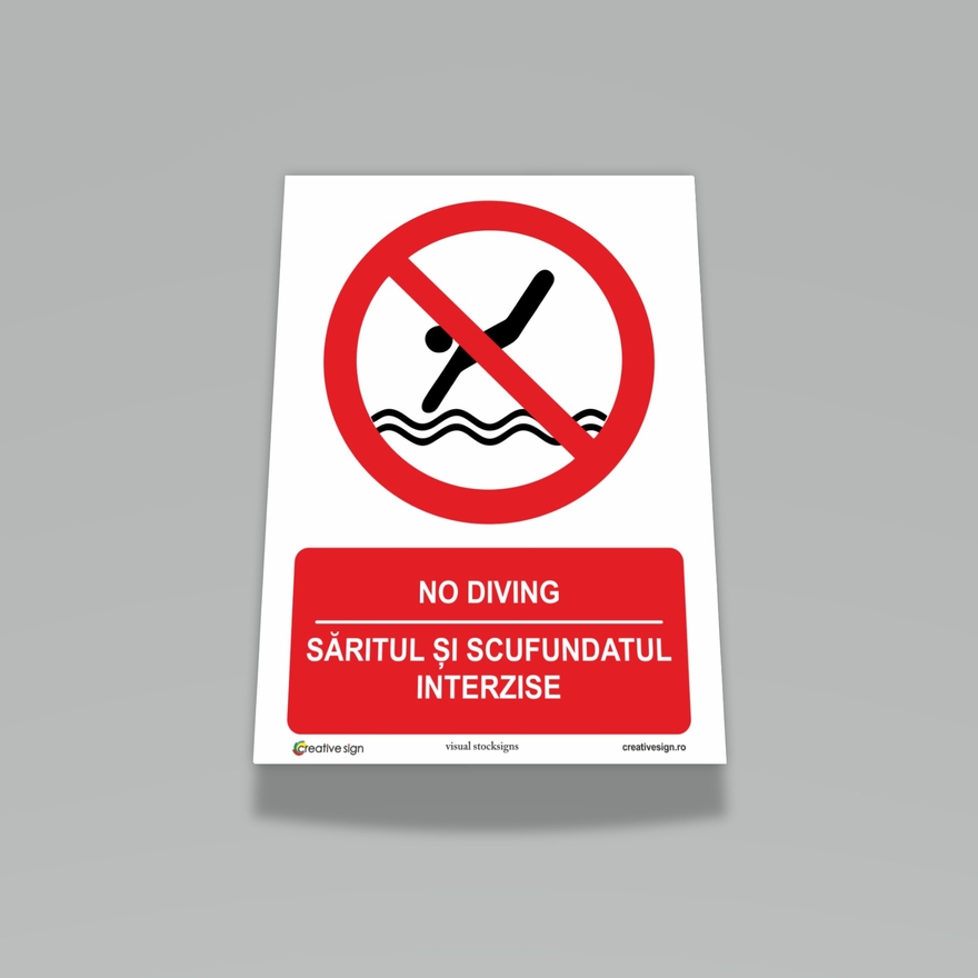 Semn de interdicție destinat zonelor cu adâncime redusă, pentru prevenirea accidentelor provocate de sărituri sau scufundări în bazin. Panoul transmite clar regula, fiind esențial pentru siguranța utilizatorilor.