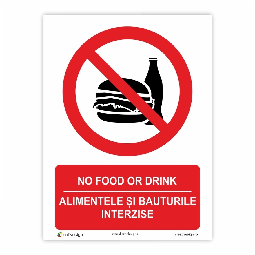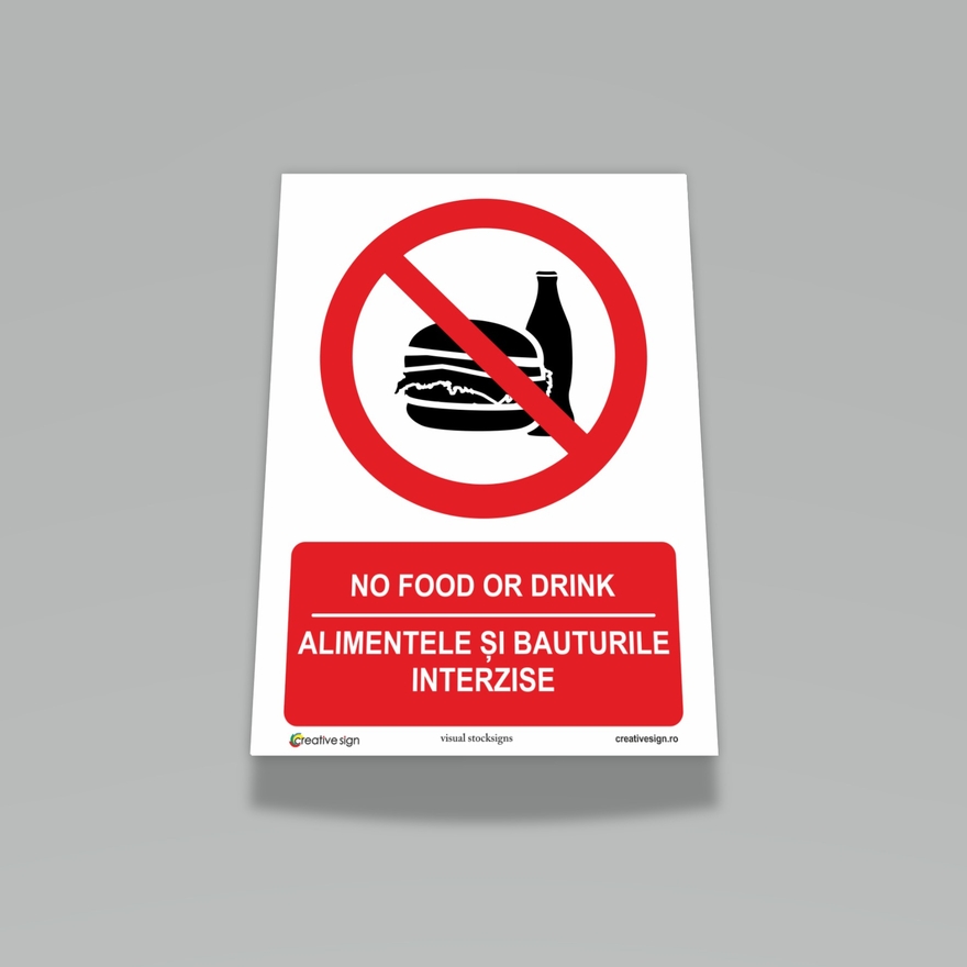 Indicator interdicție “No food or drink” / “Alimentele și băuturile interzise”