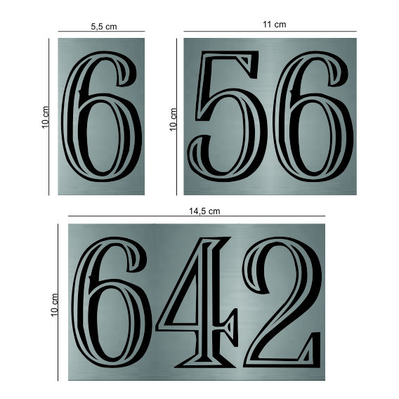 Dimensiuni cifra: 10cm înălțime și 5,5cm lățime. Indicatoarele sunt concepute pentru a se putea alatura astfel incat sa puteti compune foarte usor numere din mai multe cifre.