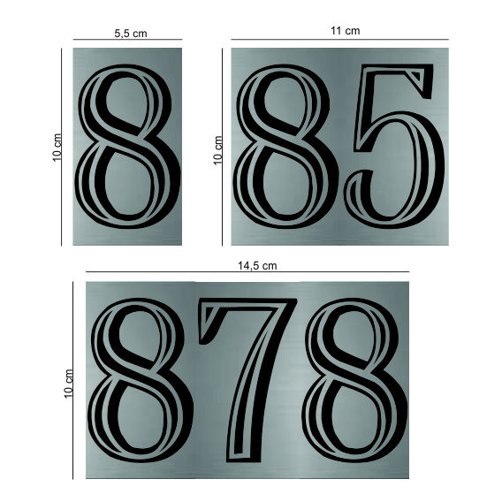 Dimensiuni cifra: 10cm înălțime și 5,5cm lățime. Indicatoarele sunt concepute pentru a se putea alatura astfel incat sa puteti compune foarte usor numere din mai multe cifre.