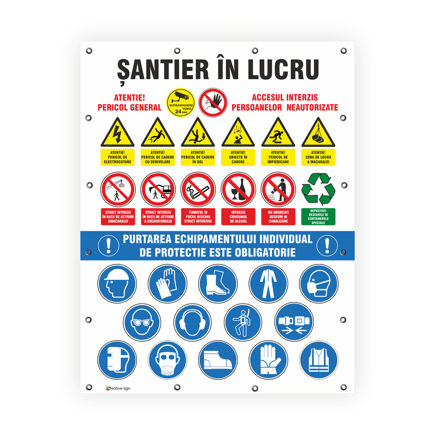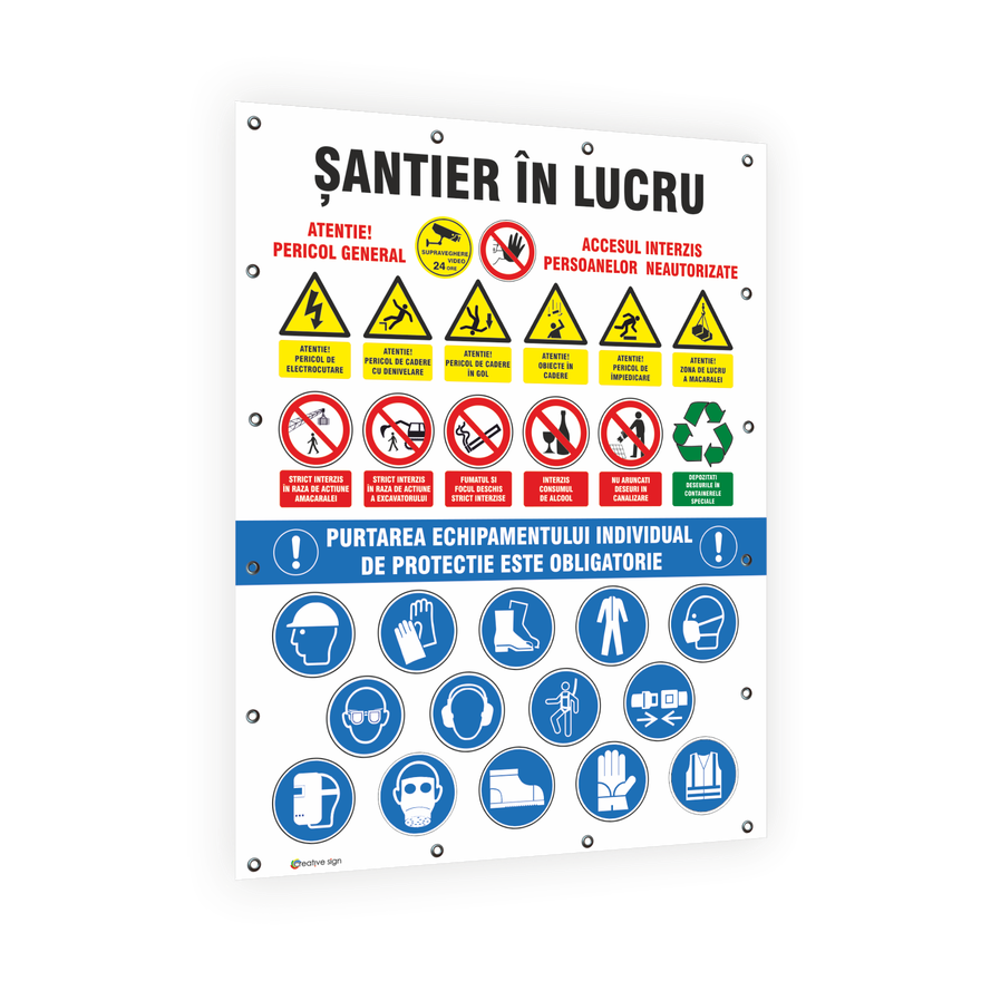 Instalare: bannerul trebuie instalat la o înalțime corespunzatoare, orientat în funcție de unghiul de vedere, ținându-se seama de eventualele obstacole, fie la intrarea intr-o zonă in cazul unui risc general, fie în imediata apropiere a unui risc determinat sau a obiectului ce trebuie semnalat și într-un loc bine iluminat, ușor accesibil si vizibil. In cazul in care condițțiile de iluminare naturala sunt precare, trebuie utilizate culori fosforescente, materiale reflectorizante sau iluminare artificială, fară a aduce atingere prevederilor legislatiei nationale care transpun Directiva 89/654/CEE.