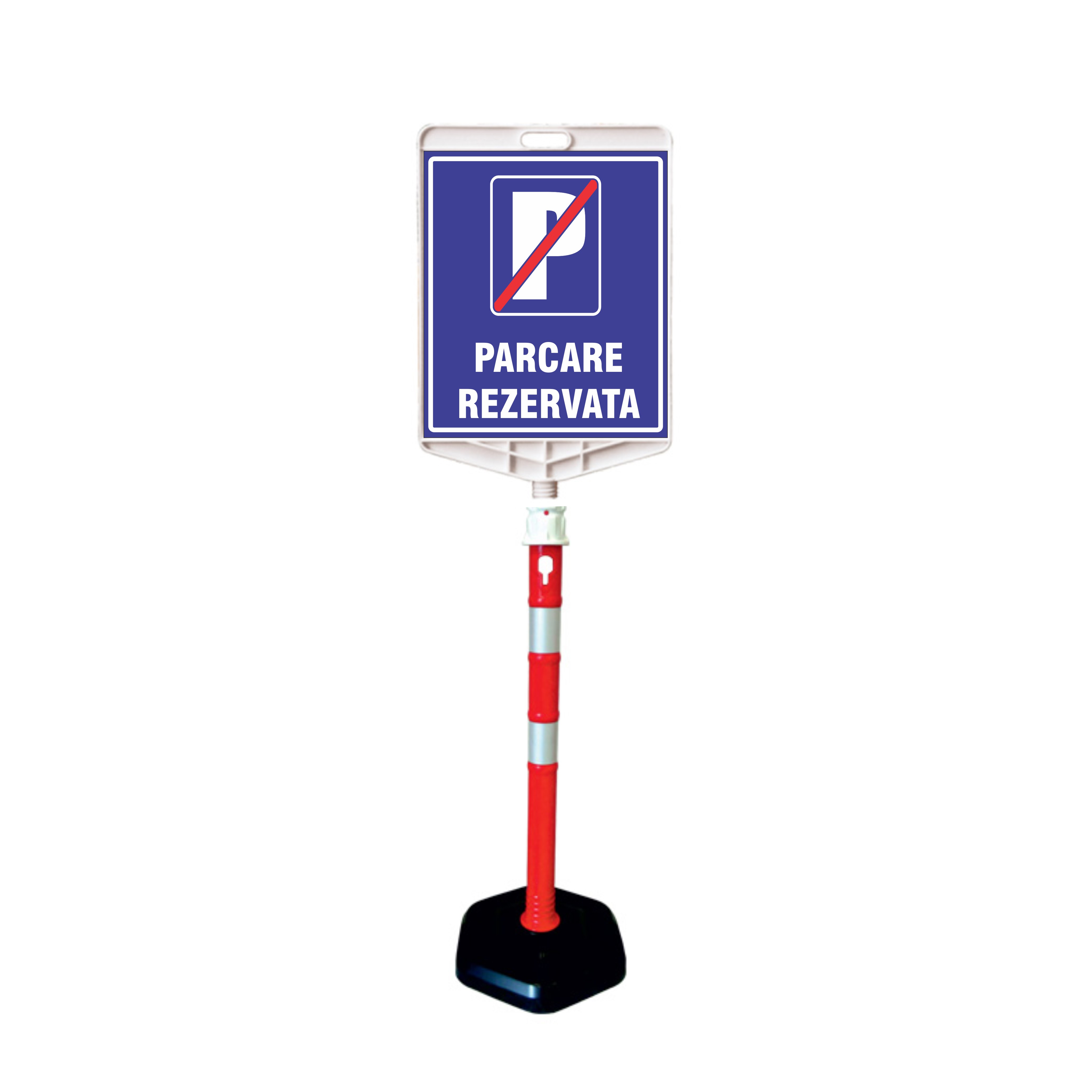 Stâlp mobil alb/roșu cu baza neagră, indicator PVC PARCARE REZERVATA față/verso.