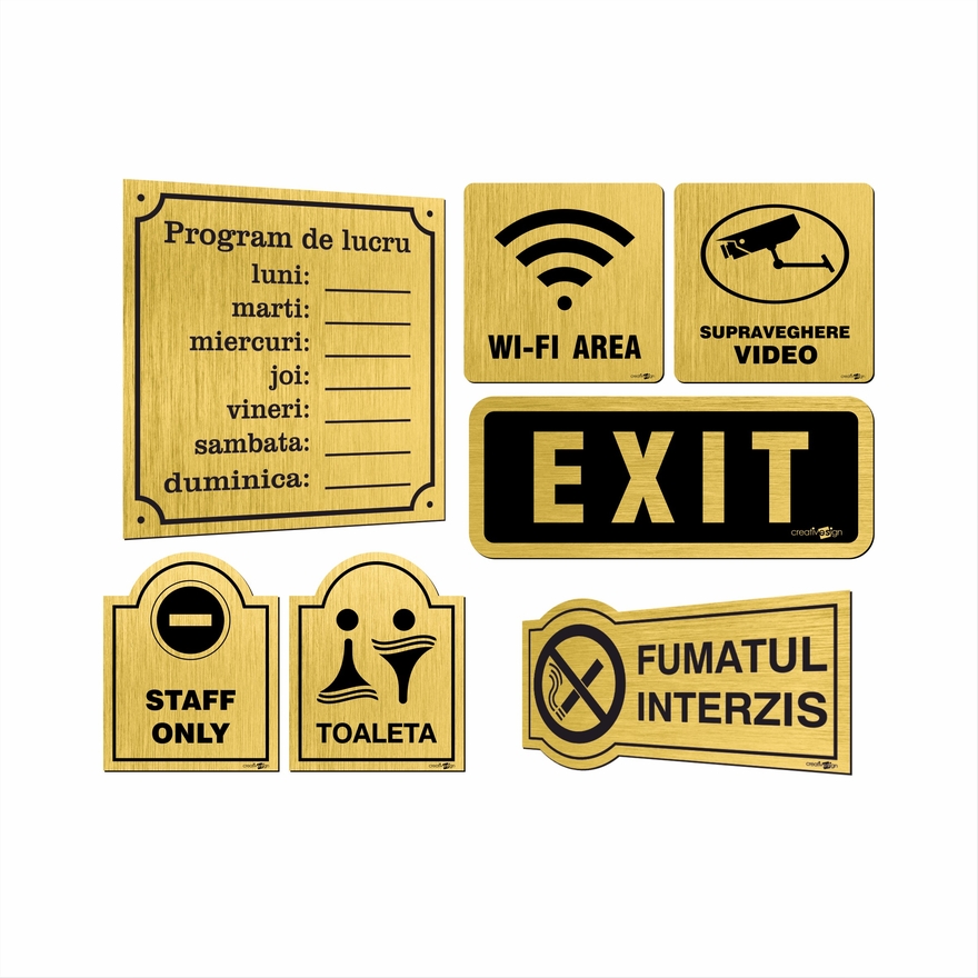 Plăcuțele includ: Program de lucru (15X15), Toaletă (10x8cm), Staff Only (10x8cm), Exit (20x8cm), Supraveghere video (10x10cm), Wi-Fi Area (10x10cm), Fumat Interzis (20x10cm).