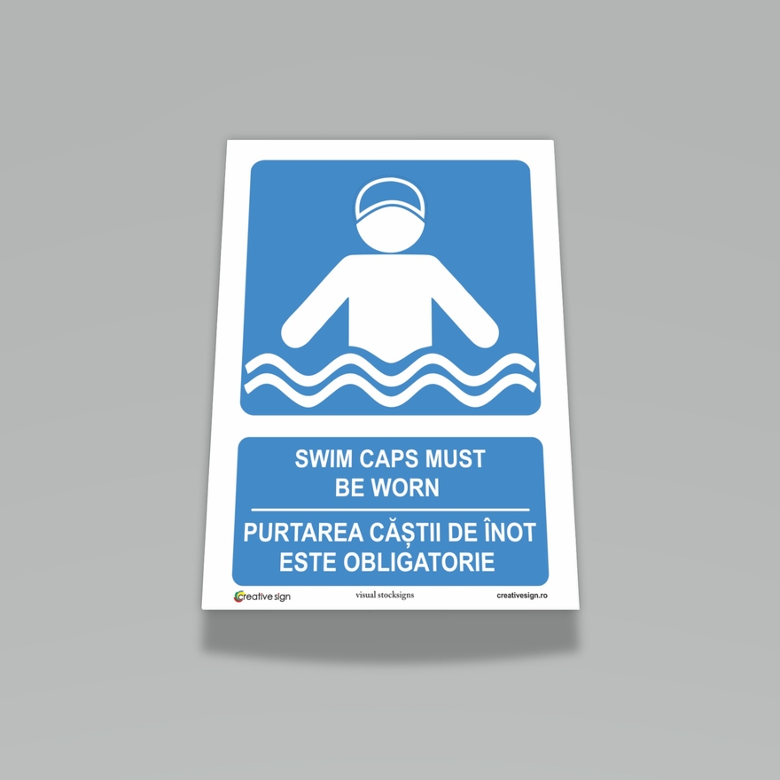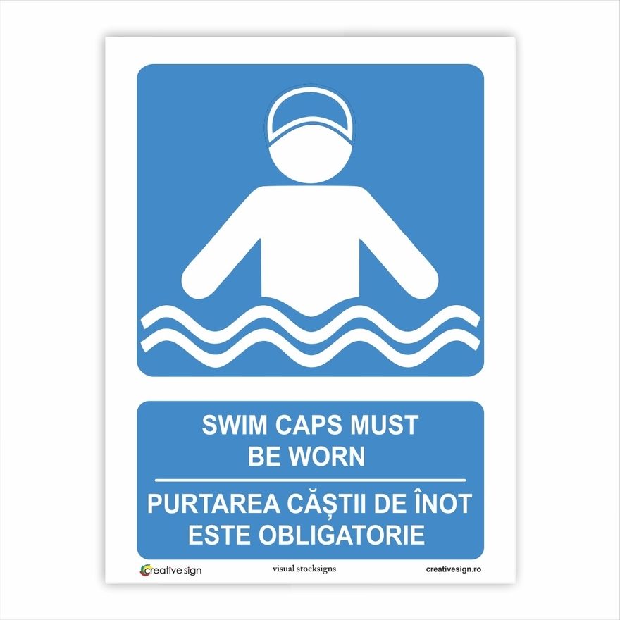Indicator obligație “Swim caps must be worn” / “Purtarea căștii de înot este obligatorie”